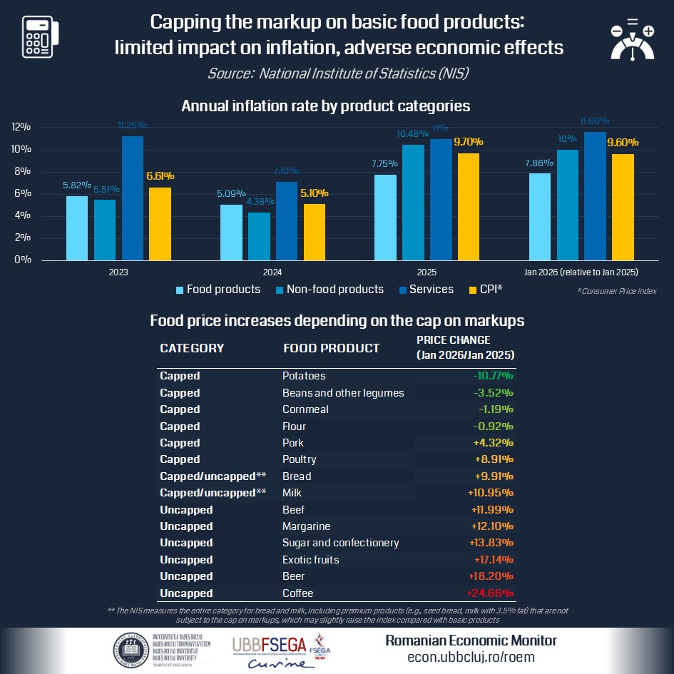 Inflation in Romania and the EU after 2021 was driven by rising energy and raw material prices, which led to a significant increase in production costs in both the food sector and other industries. The excessive budget deficit fueled inflation by causing an unsustainable rise in domestic demand. Thus, while capping markups may provide temporary relief, it cannot address the root causes of the cost-of-living crisis—at present, inflation in Romania can only be curbed through responsible fiscal policies, supported by monetary policy. Extending the cap on markups could have significant unintended consequences, ranging from higher prices for non-food items to a higher bankruptcy rate in the food sector and even local and temporary food shortages. Thus, capping markups is a double-edged sword: while it may help socially disadvantaged households in the short term, in the medium and long term the distortions created by these measures can lead to reduced availability of basic goods and foodstuffs, high inflation for uncapped products, and economic losses in the retail sector.