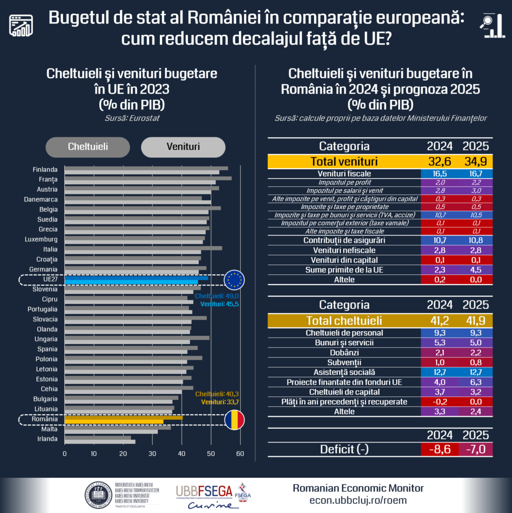 Deși cele mai recente date statistice la nivel european sunt valabile doar pentru anul 2023, acestea sunt grăitoare. Aceste date arată că în 2023, la fel ca și în anii precedenți, atât veniturile, cât și cheltuielile bugetare ale României (ca procentaj din PIB) s-au situat mult sub media UE. În 2023 cheltuielile bugetare ale României s-au aflat cu 8,7 puncte procentuale sub media UE¹, pe când acest decalaj în cazul veniturilor bugetare a fost semnificativ mai ridicată, diferența fiind de 11,8 puncte procentuale. Această diferență relativ mai mare în privința veniturilor a condus în 2023 la un deficit bugetar de 6,6% în România, pe când media UE a fost de doar 3,5%. Acest decalaj s-a accentuat și mai mult în 2024: cheltuielile guvernamentale din România au crescut și mai mult, pe când veniturile au avut doar o creștere marginală, contribuind la un deficit de aprox. 8,6% din PIB.