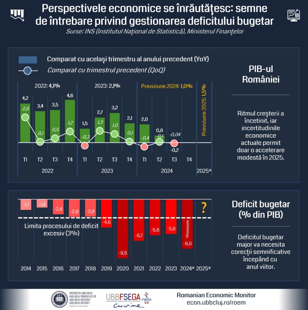Anul acesta România va înregistra foarte probabil cel mai mare deficit al bugestului statului din Îîntreaga UE. De altfel, în ultimii 6 ani, România a acumulat în fiecare an un deficit bugetar semnificativ, depășind de fiecare dată pragul de 3% a deficitului bugetar excesiv definit de Comisia Europeană. Gestionarea acestui deficit major va necesita eforturi importante nu numai în 2025 dar și în anii următori, desigur în ipoteza în care nu va fi nevoie de o corecție majoră și bruscă imediat în anul 2025. Scenariul cel mai optimist include o corecție bugetară graduală, implementată pe o perioadă de mai mulți ani. Procesul depinde desigur într-o mare măsură și de revenirea economiei UE, însă rezolvarea problemelor structurale ale economiei europene va necesita de asemenea mai mulți ani. Astfel, pe un orizont de timp de 2-3 ani, creșterea economiei României va rămâne foarte probabil sub media obișnuită de 3-4%.